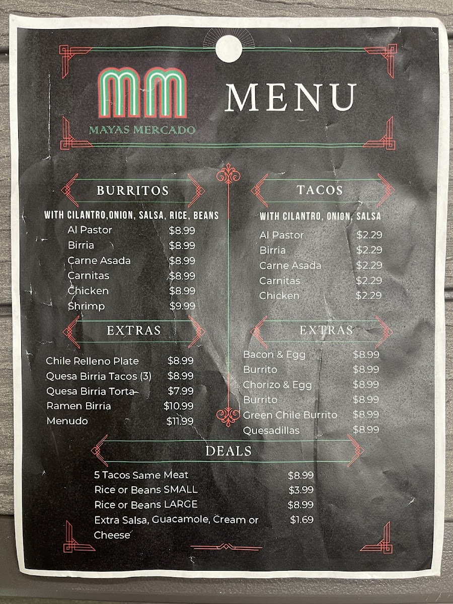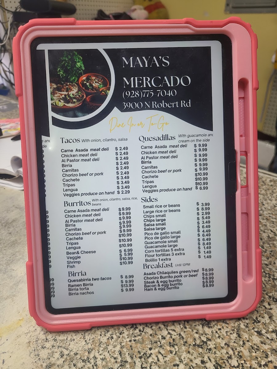 Maya's Mercado in Prescott Valley offers a vibrant and authentic taste of Mexican cuisine with a diverse menu that highlights both traditional and modern flavors. The Carne Asada Burrito is a standout, featuring perfectly seasoned grilled beef wrapped in a warm tortilla with fresh salsa and guacamole. Another favorite is the Chile Relleno, a deliciously stuffed poblano pepper paired with a rich tomato sauce that complements the dish’s smoky flavor. For those craving something lighter, the Street Tacos offer a variety of fillings such as carnitas, chicken, and fish, each topped with cilantro, onions, and a squeeze of lime. If you're in the mood for a heartier option, the Mole Enchiladas serve up a comforting plate of corn tortillas smothered in a savory, slightly sweet mole sauce, offering layers of deep, rich flavor. The restaurant also excels in sides like the Elote, grilled corn on the cob slathered in creamy mayonnaise, chili powder, and cheese, which adds a perfect balance to any meal. Whether you're enjoying a casual lunch or a family dinner, Maya’s Mercado’s menu promises a satisfying experience for anyone looking to indulge in the bold flavors of Mexico.